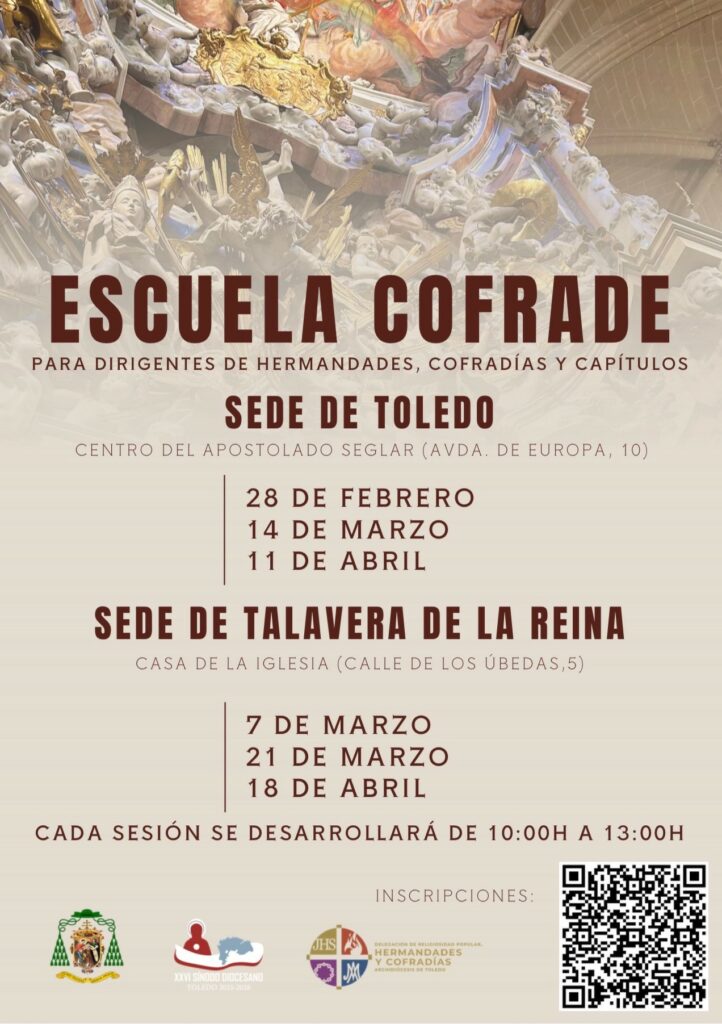 La Escuela Cofrade, dirigida a responsables y miembros de juntas de gobierno de hermandades, cofradías y capítulos, ha anunciado una nueva edición formativa que se desarrollará en las sedes de Toledo y Talavera de la Reina durante los meses de febrero, marzo y abril.